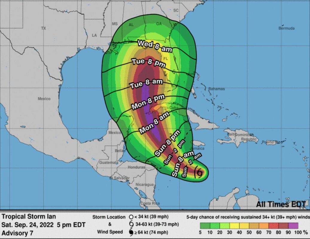 Pues de acuerdo a los actuales datos, y de continuar la trayectoria pronosticada, los embates de los fuertes vientos y lluvias de «Ian» ya como «huracán», estarían afectando las costas de los municipios de la zona norte de Quintana Roo, principalmente Cancún la noche del próximo domingo, aunque todavía se desconoce que tan cerca estaría del estado.