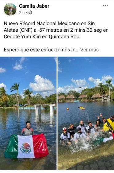 Camila Jaber establece nuevo récord «sin aleta» en Cenote Yum ki´n.- Camila Jarber, la nadadora en apnea, o nado de profundidad libre (sin equipo), conocida como «La Sirena Mexicana», logró establecer un nuevo récord nacional en la especialidad, al conseguir un descenso a 57 metros en 2 minutos y 30 segundos.