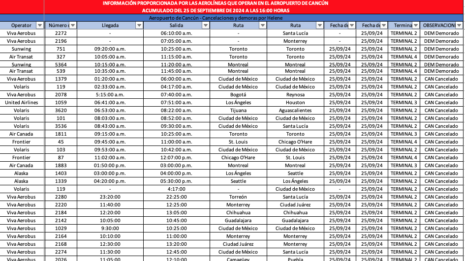 A los que se agregan también un total de 95 vuelos demorados, entre los que se encuentran 46 vuelos de llegada y 49 de salida, siendo estas las únicas afectaciones al momento relacionadas con el ahora huracán Helene.