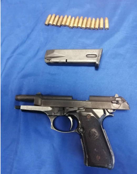 Los agentes de la Policía Quintana Roo, incautaron al lesionado una pistola escuadra marca Pietro Beretta, de color negro y calibre nueve milímetros, con su respectivo cargador abastecido con 15 cartuchos útiles