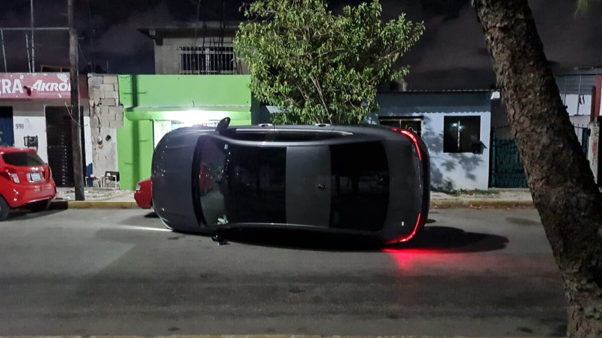 Ebrio impacta a autos estacionados y vuelca en la super manzana 100 de Cancún, un sujeto en completo estado de ebriedad se quedó dormido al volante y al perder el control de la unidad se impactó contra un par de autos estacionados volcando.