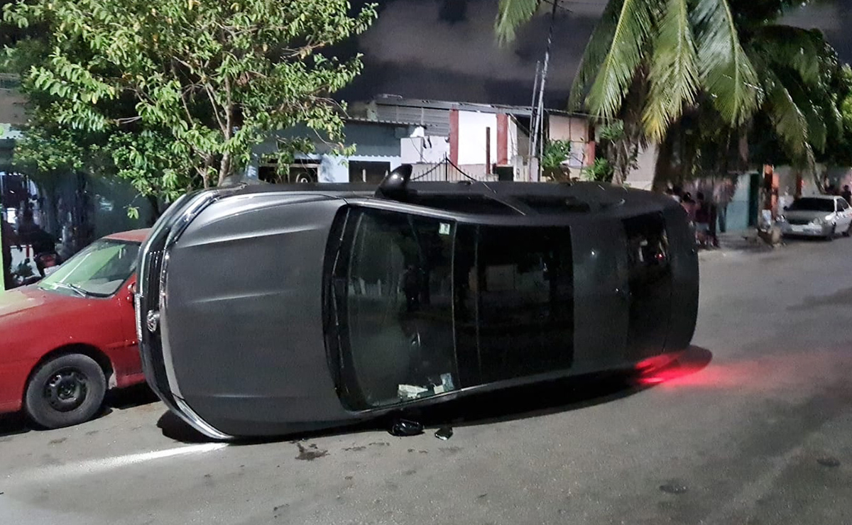 Ebrio impacta a autos estacionados y vuelca en la super manzana 100 de Cancún, un sujeto en completo estado de ebriedad se quedó dormido al volante y al perder el control de la unidad se impactó contra un par de autos estacionados volcando.
