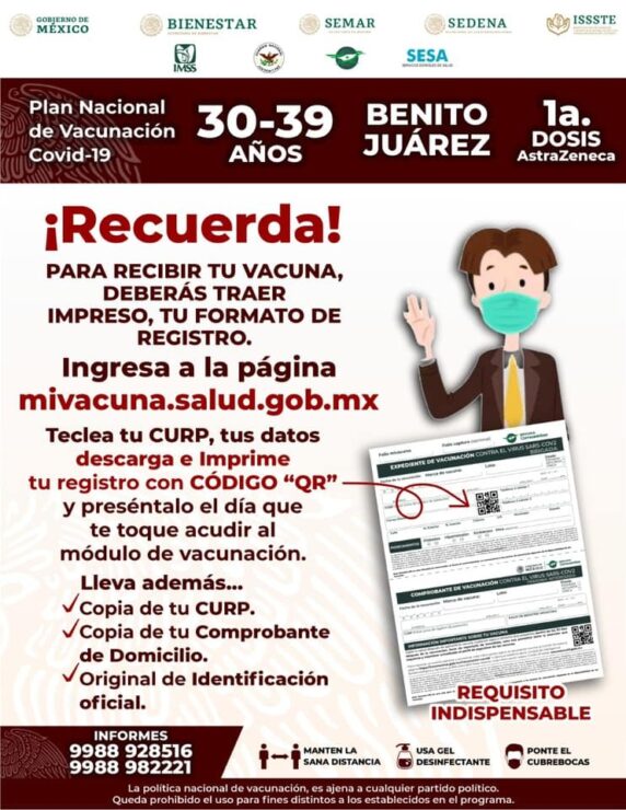 Cancún: Inicia el martes 29 vacunación contra Covid-19 para 30-39 años; instalarán 6 módulos para aplicar la primera dosis de AstraZeneca.