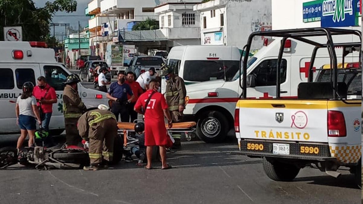 Un microbús de los que cubren la ruta foránea Cancún-Playa, arrolla a dos motociclistas y termina impactando a un automóvil casi en el cruce de las avenidas Leona Vicario y Javier Rojo Gómez (Kabah), en la super manzana (SM) 219.