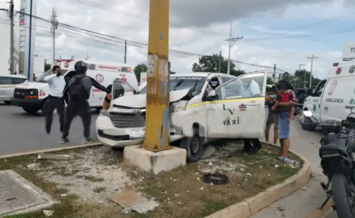 Al llegar al cruce de la avenida Chac Mool, presuntamente el conductor de la camioneta no hizo su alto obligatorio, impactando al taxi y proyectándolo contra la base de un poste de una de las guarniciones centrales de la avenida.