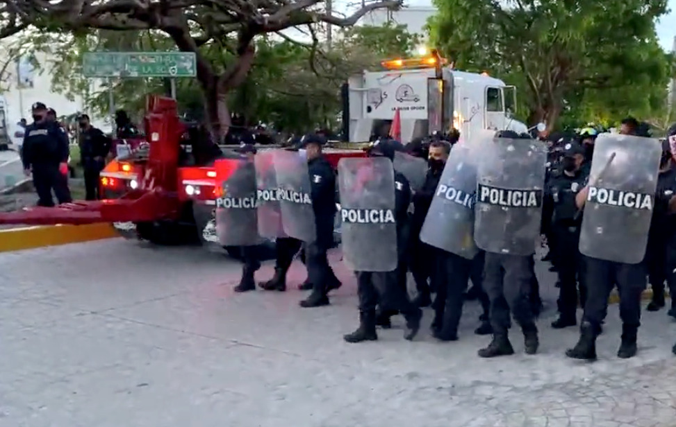 Por lo cual fue desplegado un enorme contingente de policías antimotines en el cruce de las avenidas Tulum y Uxmal, en donde se encontraba la mayor parte de los camiones recolectores que los manifestantes llevaron.