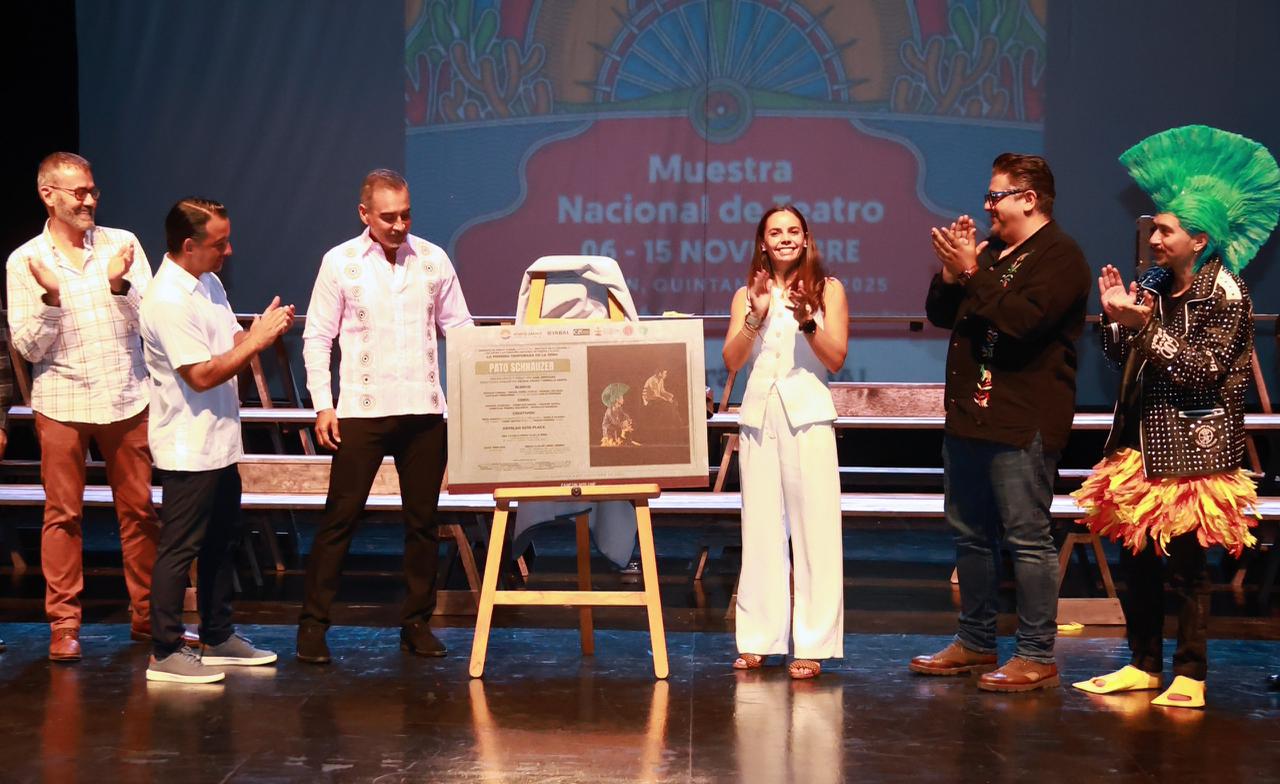 Al término de esta puesta en escena, entre aplausos y una atmósfera de celebración, Ana Paty Peralta, acompañada de Carlos López Jiménez y del talentoso cantautor quintanarroense Omar Terrazaz, develó la placa conmemorativa, símbolo de conclusión de esta memorable jornada teatral.