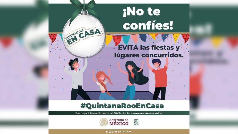 La Doctora Xóchitl Refugio Romero Guerrero, Titular del Órgano de Operación Administrativa Desconcentrada Quintana Roo, invita a seguir las medidas de higiene: estornudar o toser en el ángulo interno del brazo, usar frecuentemente el alcohol gel si no es posible lavarse las manos con agua y jabón; no asistir a reuniones en esta temporada, aun cuando las familias quieren estar cerca y hacerse demostraciones de afecto, como abrazos y besos; y vigilar que el aforo de las convivencias en espacios cerrados como en el trabajo y el hogar no sea mayor a 10 personas.