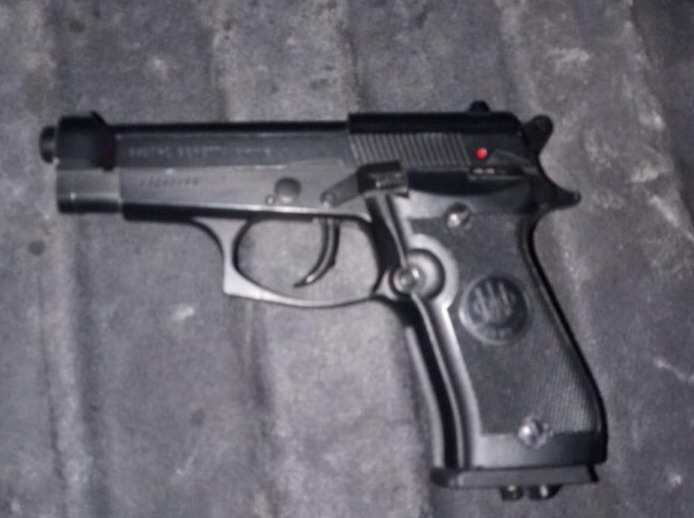 Por lo cual fue necesario someterlos y realizarles una revisión, en donde se les encontró un arma de Co2 réplica exacta de una pistola Beretta 92FS calibre 9 mm. de la cual no pudieron explicar su portación.