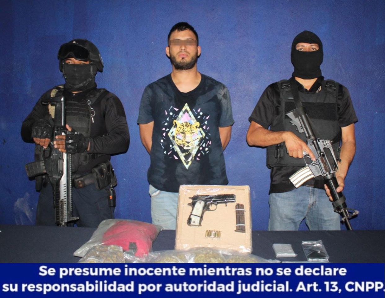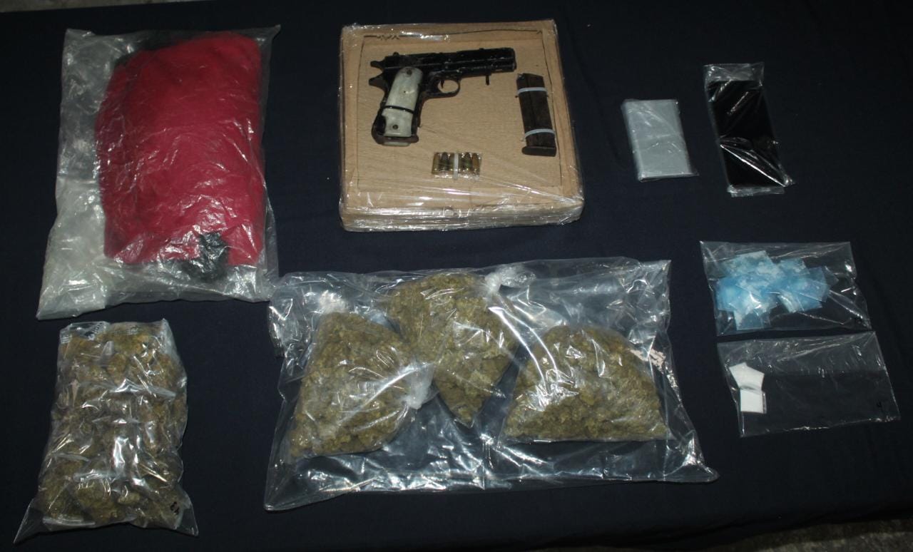 En una acción rápida los agentes lograron acorralarlos para posteriormente realizarles una inspección física y se les decomisó: 20 dosis de polvo blanco con las características de la cocaína, cuatro dosis de con fragmentos sólidos similares a la droga conocida como crack, 40 dosis de la droga conocida como cristal, 162 dosis de vegetal verde con las características de la marihuana, un arma de fuego corta de color negro con cacha de color plata, un cargador, cinco cartuchos útiles 45 milímetros, una mochila táctica negra, una bolsa roja y una caja pequeña.