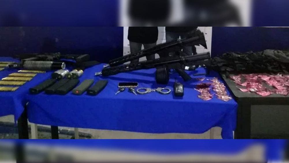 El arsenal que se les requisó a los presuntos sicarios consta de tres fusiles automáticos calibre .223, un lanzagranadas, así como 365 cartuchos para estas armas, 18 para pistola 9 mm, seis cargadores para fusil de asalto, un abastecedor de cargadores, dos cargadores de tambor circular, uno con capacidad de 60 cartuchos y otro de cien, y cuatro granadas para fusil calibre 40.