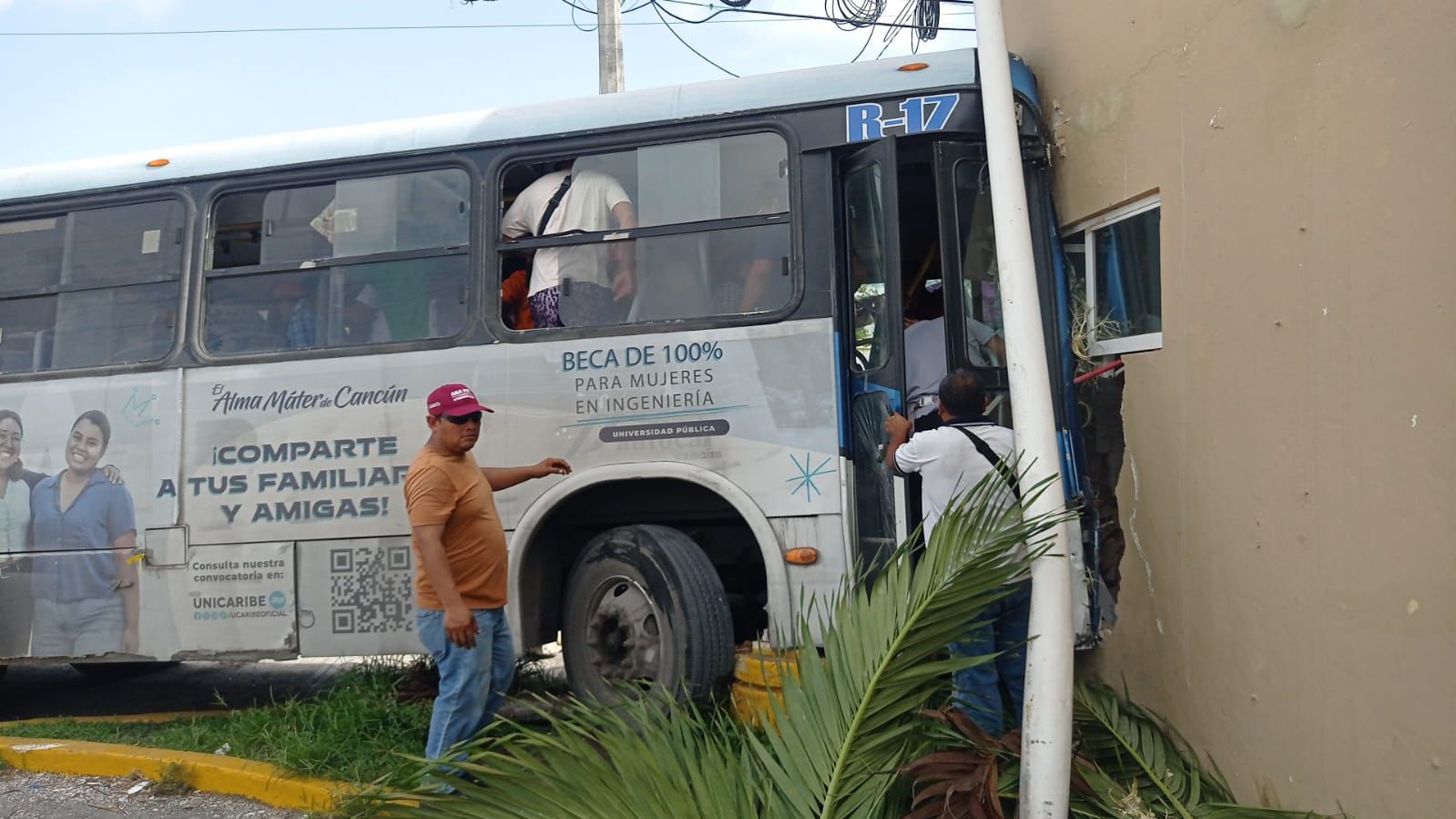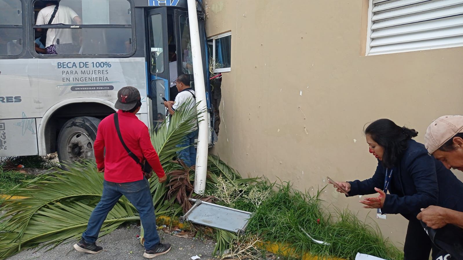 Choca autobús contra muro en una gasolinera de la Leona Vicario y Kabah; al menos 30 pasajeros heridos; el conductor perdió el control y se subió a la banqueta.