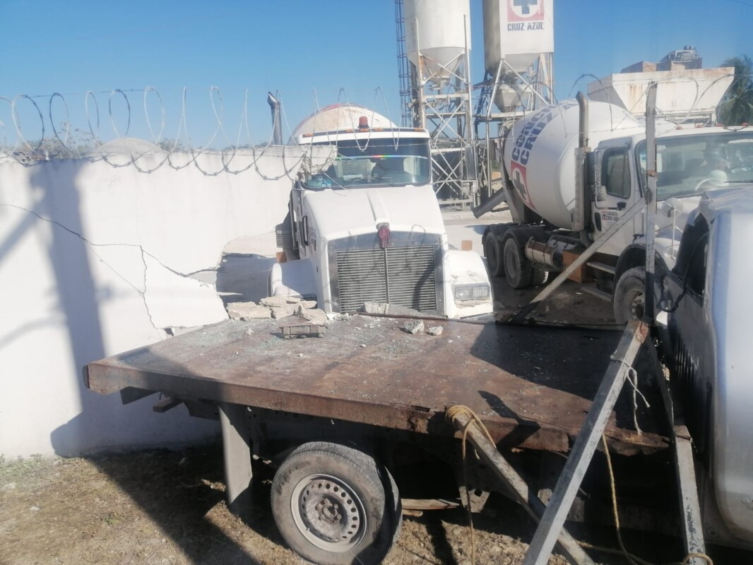 Asimismo, continúa su trayectoria hasta chocar contra un muro de concreto, derribándolo y ocasionando daños a dos camiones que se encontraban estacionados al interior de una propiedad de Concretos Cruz Azul.