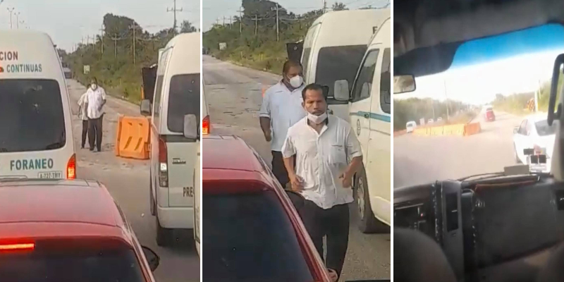 Choferes de unidades turísticas retiraron las barreras de señalización que impiden el paso por la zona donde se encuentra en socavón en la carretera Cancún-Playa del Carmen.