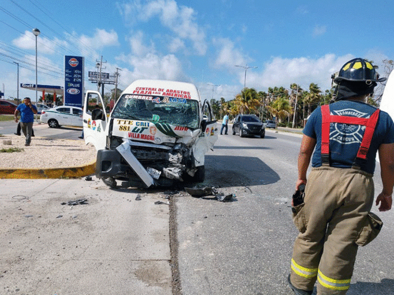 Cancún, Quintana Roo.- Una van del servicio público de pasajeros se estrelló contra un tráiler en el Bulevar Colosio de Cancún, con saldo de tres lesionados, entre ellos el chofer que quedó prensado en la unidad.