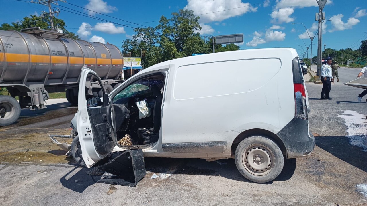 El percance ocurrió cuando la pipa transportadora de combustible estaba en plena maniobra de retorno de vía, cuando una camioneta Minivan se impactó a un costado del pesado vehículo.