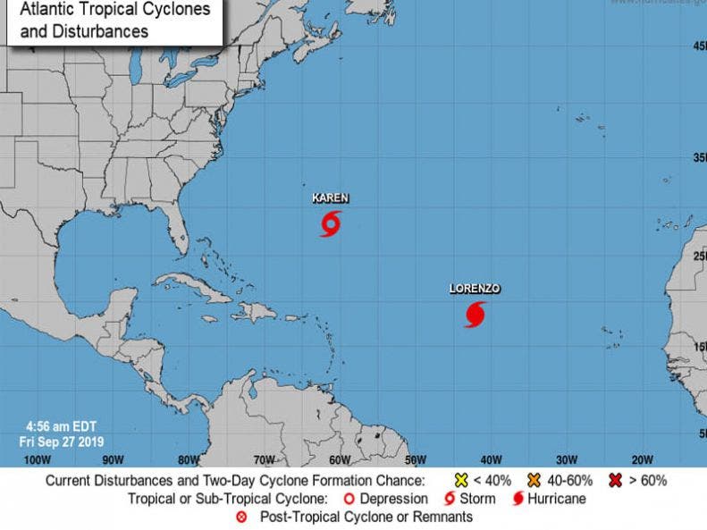 La tormenta tropical “Karen”, en el océano Atlántico, se localiza a 565 kilómetros al sureste de Las Bermudas, se mueve al noreste (55° grados) a razón de 13 kph, con vientos máximos cerca del centro de 65 kph, por su lejanía y dirección de movimiento no representan ningún riesgo para las costas nacionales, se le da seguimiento.