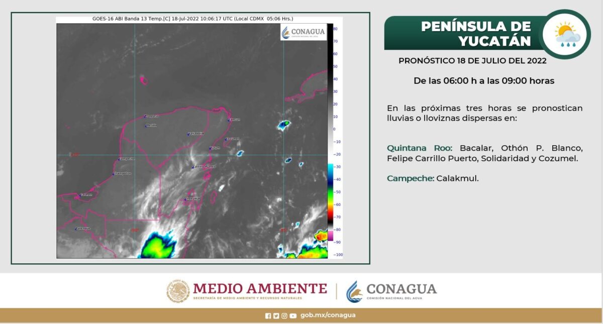 Península de Yucatán: Cielo parcialmente nublado durante la mañana y nublado por la tarde, con chubascos y descargas eléctricas en la península. Ambiente matutino templado y caluroso a muy caluroso por la tarde. Viento del este y noreste de 15 a 30 km/h en la región con rachas de 50 a 60 km/h en zonas costeras de Campeche, Yucatán y Quintana Roo.