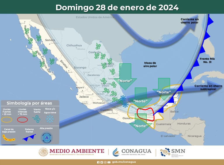 La Coordinación Estatal de Protección Civil informó que dicho fenómeno está ubicado hasta el mediodía de hoy viernes, sobre el centro de la República Mexicana, se mueve al este-sureste originando descenso en las temperaturas, viento fresco y arrachado del norte, nubosidad y lluvias sobre su área de influencia, mismo que estará influenciando gradualmente a la Península de Yucatán y a Quintana Roo, en el transcurso del domingo 28 de enero.