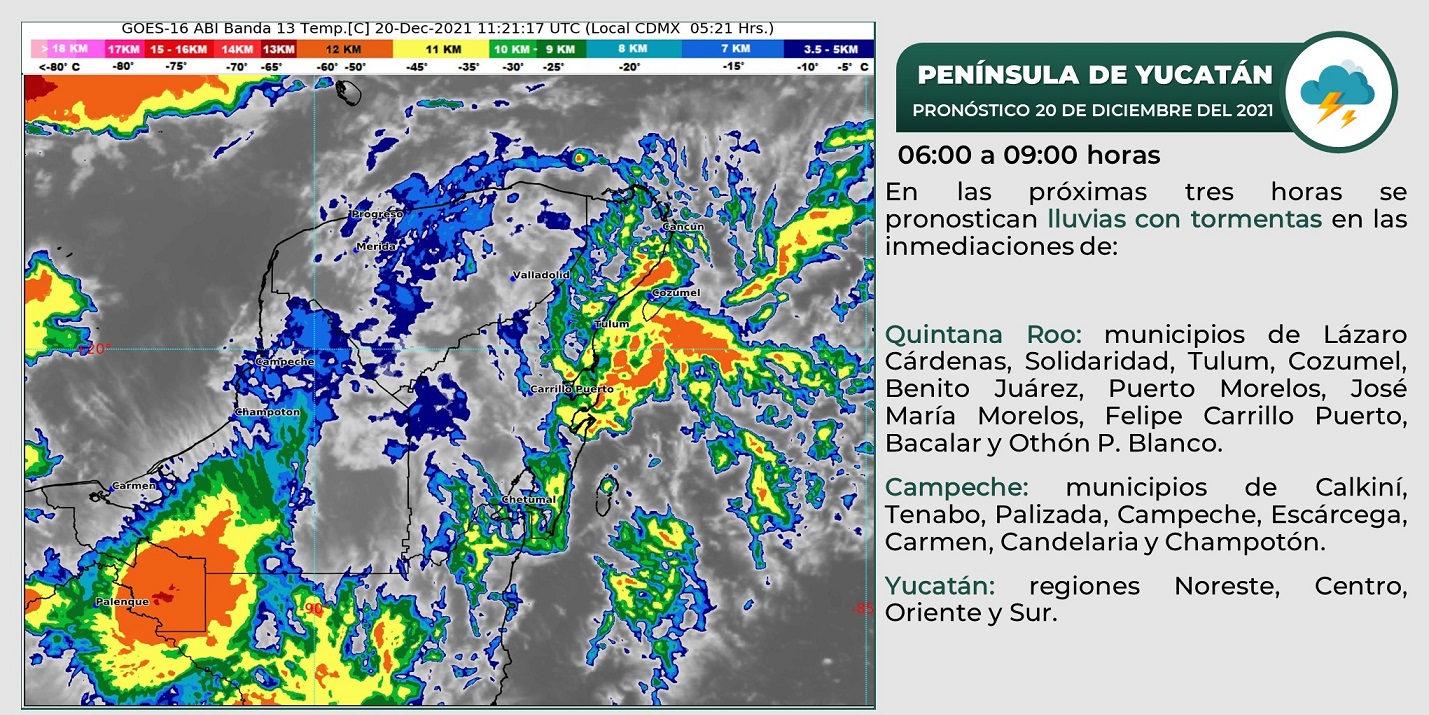 Península de Yucatán: Cielo nublado la mayor parte del día con lluvias puntuales intensas en Campeche, muy fuertes en Yucatán y fuertes en Quintana Roo, todas acompañadas de descargas eléctricas. Ambiente templado al amanecer y caluroso durante la tarde. Viento de dirección variable de 15 a 30 km/h con rachas de hasta 40 km/h en costas de Yucatán y Quintana Roo. Evento de «Norte» con rachas de 50 a 60 km/h en costas de Campeche.