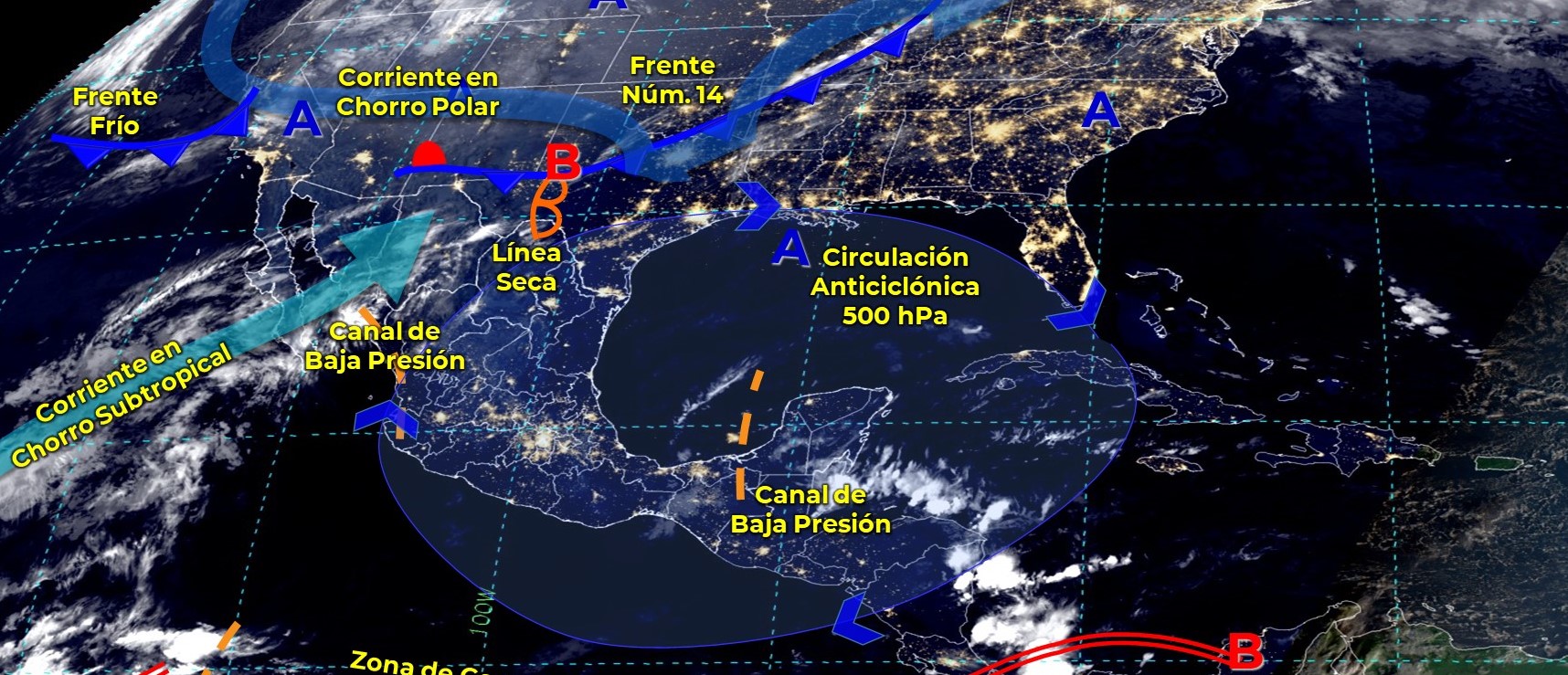 Por otra parte, canales de baja presión en combinación con la entrada de humedad proveniente de ambos océanos e inestabilidad en la atmósfera superior, originarán lluvias y chubascos acompañados de descargas eléctricas sobre el occidente, centro, sur y sureste del territorio nacional, incluida la Península de Yucatán.