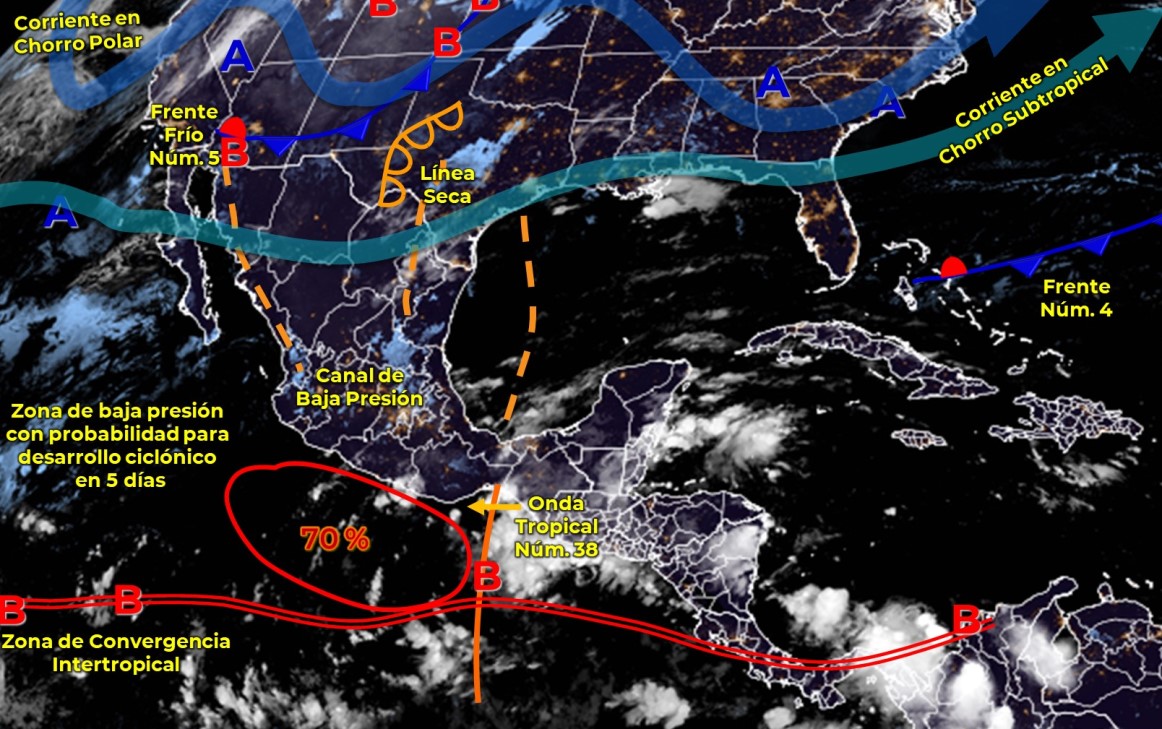 Por otra parte, el frente frío número 5 se extenderá cercano a la frontera norte de México e interaccionará con una línea seca en el norte de Coahuila, generando lluvias aisladas y rachas fuertes de viento en el norte y noreste del país.