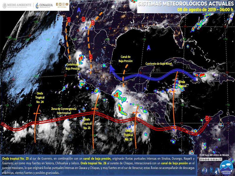 Pronóstico del clima para hoy en Quintana Roo; la onda tropical número 26 está cruzando sobre las aguas litorales de Guatemala en el Océano Pacífico, sin efectos sobre la Península de Yucatán, sólo en el sureste mexicano y Golfo de Tehuantepec, incrementará la actividad lluviosa.