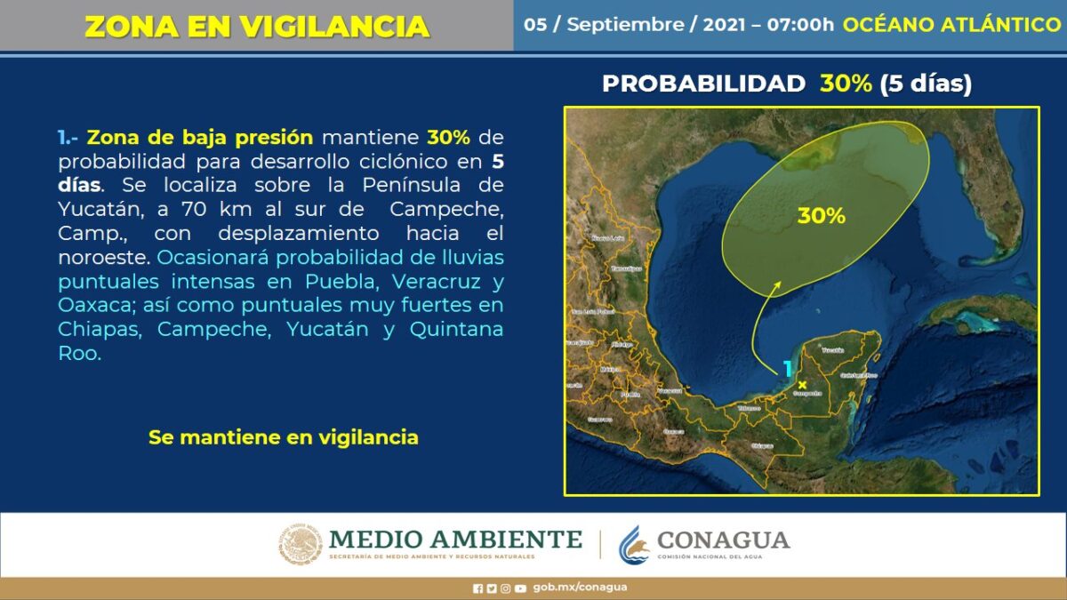 Clima: Pronostican lluvias fuertes hoy domingo en Quintana Roo. Este día, una zona de baja presión con probabilidad de desarrollo ciclónico, localizada sobre el sur del Golfo de México, interaccionará con la nueva onda tropical número 27 que se aproximará a la Península de Yucatán, originando lluvias puntuales intensas, descargas eléctricas y posible caída de granizo en zonas de Puebla, Veracruz y Oaxaca; así como lluvias fuertes a muy fuertes en el oriente y sureste del país, además de la Península de Yucatán. En tanto que, un canal de baja presión extendido sobre la Mesa del Norte y la Mesa Central, en interacción con inestabilidad atmosférica superior y con la entrada de humedad del Océano Pacífico, producirán chubascos y lluvias fuertes a muy fuertes con descargas eléctricas y posibles granizadas en zonas del noroeste, norte, occidente, centro y sur del territorio nacional.