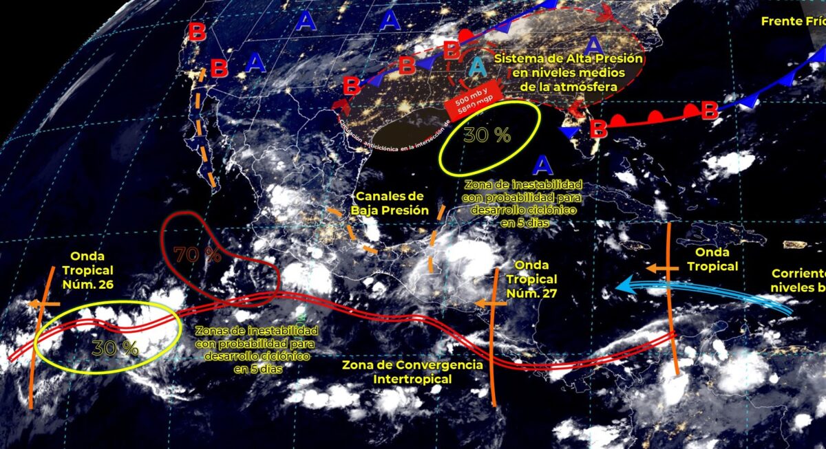 Clima: Pronostican lluvias fuertes hoy domingo en Quintana Roo. Este día, una zona de baja presión con probabilidad de desarrollo ciclónico, localizada sobre el sur del Golfo de México, interaccionará con la nueva onda tropical número 27 que se aproximará a la Península de Yucatán, originando lluvias puntuales intensas, descargas eléctricas y posible caída de granizo en zonas de Puebla, Veracruz y Oaxaca; así como lluvias fuertes a muy fuertes en el oriente y sureste del país, además de la Península de Yucatán. En tanto que, un canal de baja presión extendido sobre la Mesa del Norte y la Mesa Central, en interacción con inestabilidad atmosférica superior y con la entrada de humedad del Océano Pacífico, producirán chubascos y lluvias fuertes a muy fuertes con descargas eléctricas y posibles granizadas en zonas del noroeste, norte, occidente, centro y sur del territorio nacional.