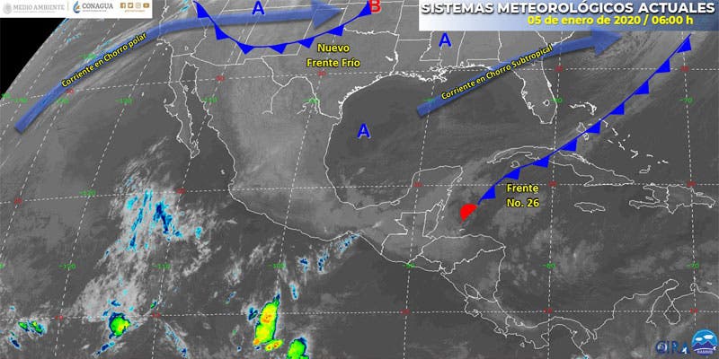 El frente estacionario No. 26 se extiende sobre la porción occidental del mar Caribe e isla de Cuba hasta las costas orientales de Estado Unidos, dejando de afectar la región peninsular.
