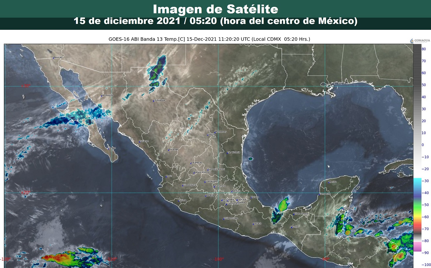 Pacífico Sur: Cielo medio nublado a nublado con lluvias puntuales fuertes en Chiapas, chubascos en Oaxaca y lluvias aisladas en Guerrero. Temperaturas frías con bancos de niebla matutinos en sierras de la región y ambiente caluroso por la tarde en zonas costeras. Viento de componente norte con rachas de 60 a 70 km/h en el Istmo y Golfo de Tehuantepec con oleaje de 1 a 2 metros.