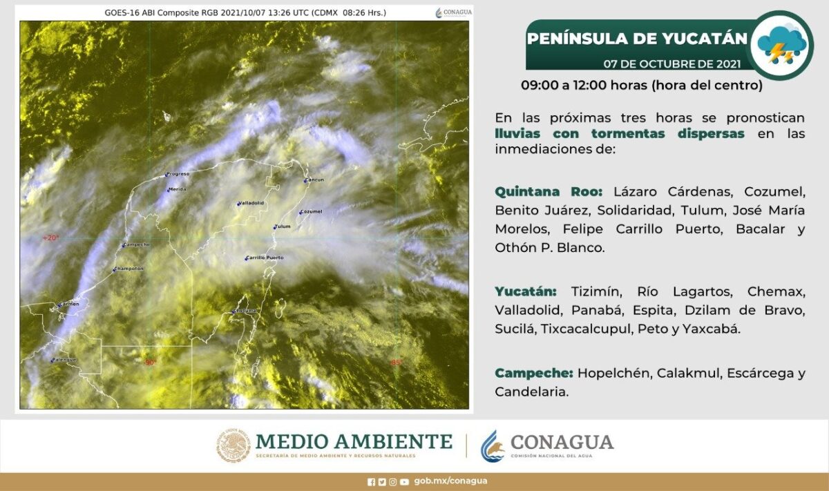 Las condiciones meteorológicas para la Península de Yucatán serán de cielo nublado la mayor parte del día, ambiente templado por la mañana y caluroso durante la tarde, descargas eléctricas y caída de granizo en zonas de lluvia, y viento del este de 20 a 35 km/h, además de posibles trombas marinas en costas de Campeche.