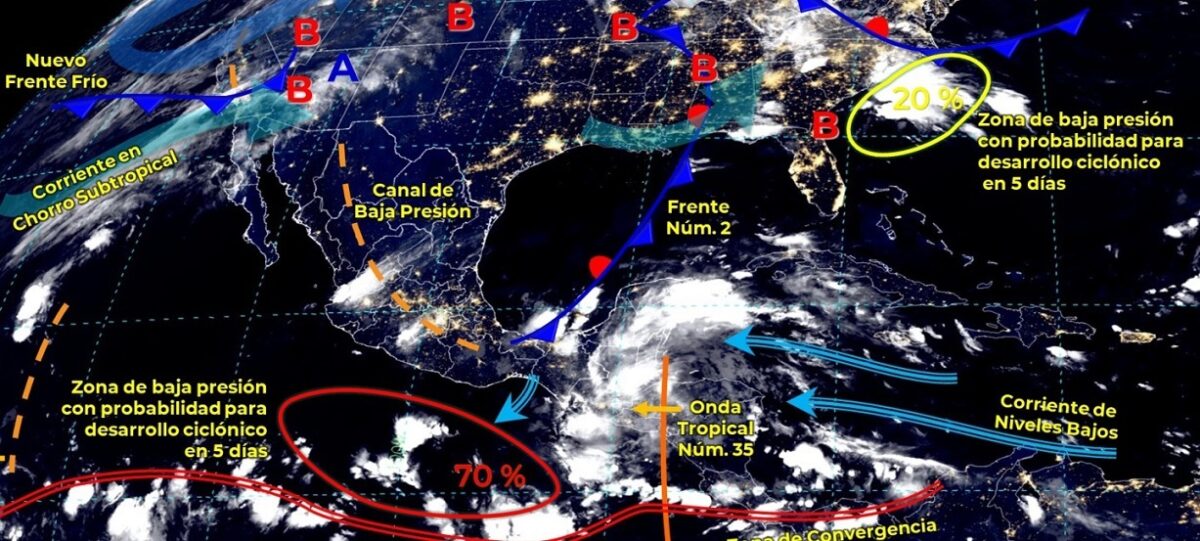 Clima: Se prevén lluvias fuertes para hoy jueves en Quintana Roo; el frente frío 2 interaccionará con la onda tropical 35 en la zona Sureste.