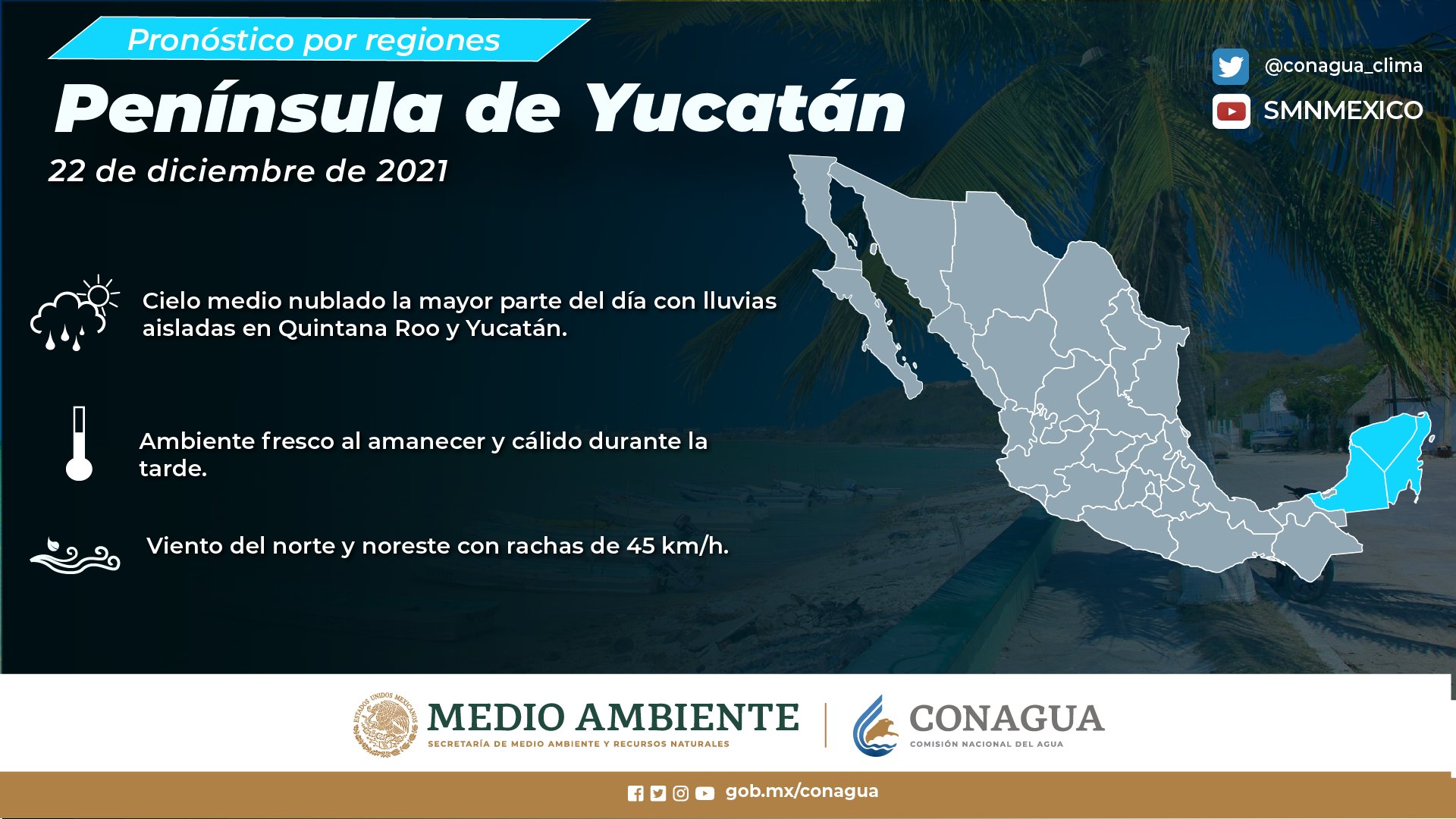Península de Yucatán: Cielo medio nublado la mayor parte del día con lluvias aisladas en Quintana Roo y Yucatán. Ambiente fresco al amanecer y cálido durante la tarde. Viento del norte y noreste con rachas de 45 km/h.