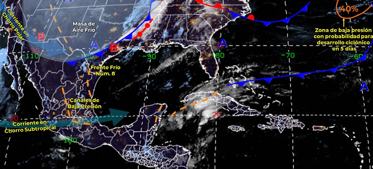 Clima: Temperaturas frescas y posibilidad de chubascos para Quintana Roo. Se mantiene el sistema de alta presión localizado en superficie y se ubica su centro cerca de la costa este de Estados Unidos, en su amplia circulación periférica impulsa la masa de aire polar continental muy modificado, sobre el Golfo de México, Península de Yucatán, estado de Quintana Roo y porción occidental del mar Caribe.