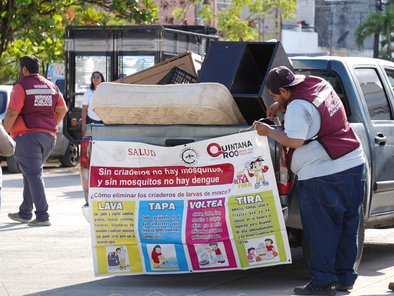 “Abran puertas y ventanas cuando pasen las camionetas con la fumigación, el producto no es dañino para los niños y mascotas; también es muy importante lavar, tapar, voltear y tirar todos los recipientes que tienen algún tipo de líquido”, comentó.