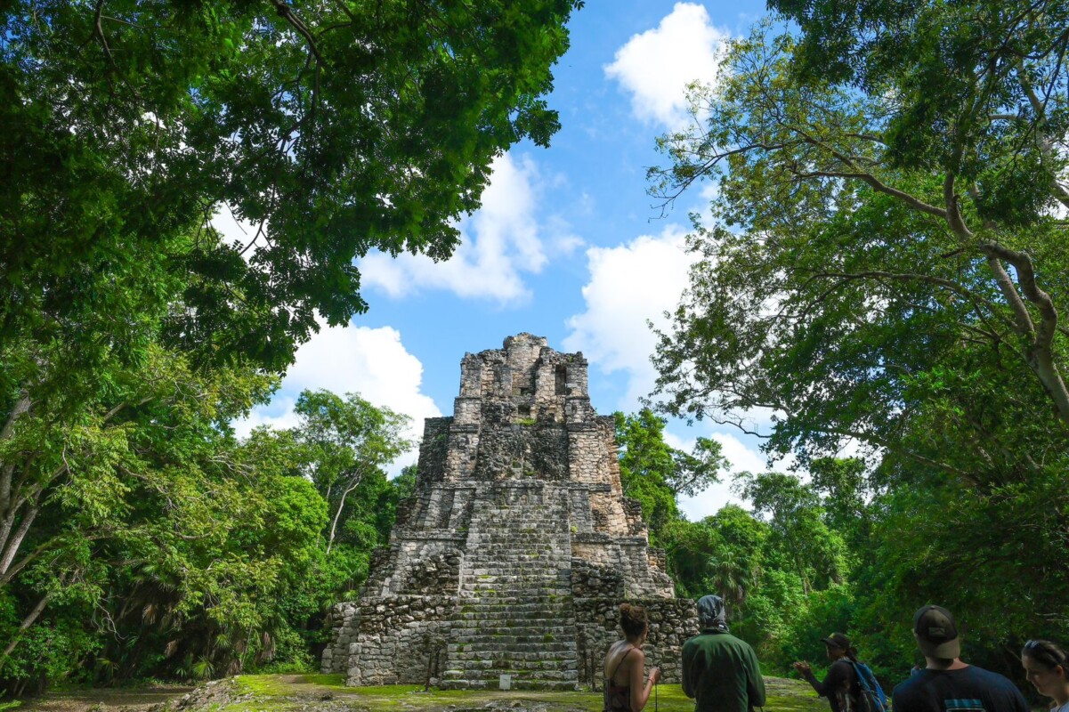 De aquí se avanza hacia Cobá, una ciudad maya comunicada a través de una extensa red de caminos blancos, los sac be, que comunicaba a otros pueblos mayas, con una pirámide Nochoch Mul, de casi 50 metros de altura.