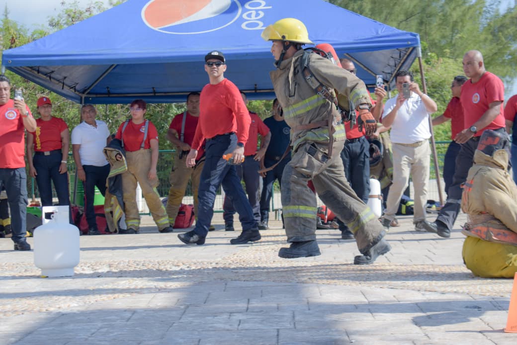El Bombero Challenge Cancún 2025 consta de ocho retos físicos que simulan escenarios de emergencia real, como arrastre de maniquí, entrada forzada, combate de incendios, escalada de pisos con manguera al hombro y precisión con chorro de agua.