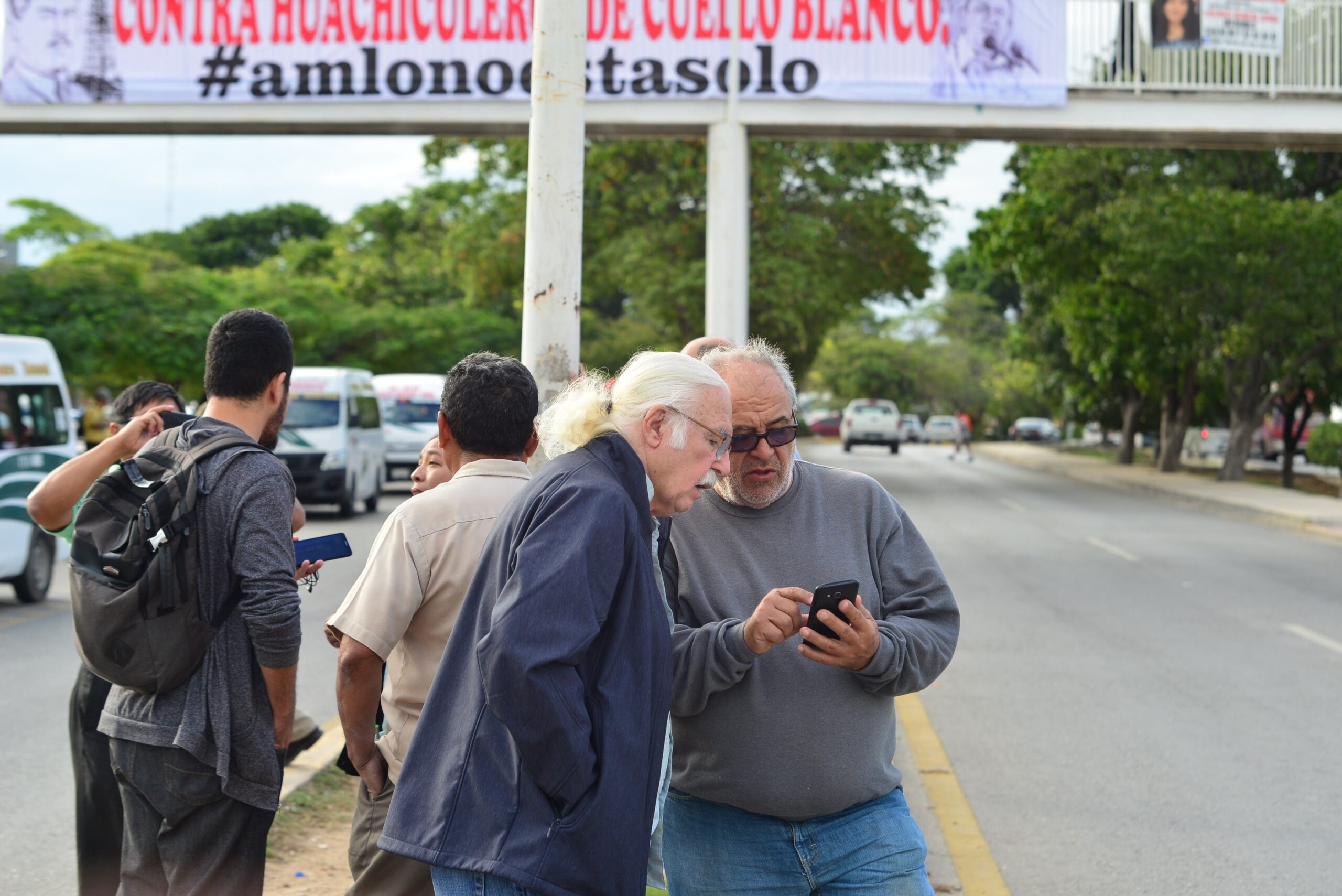 Manuel López Obrador. Con mantas respaldan lucha contra el “huachicoleo”.