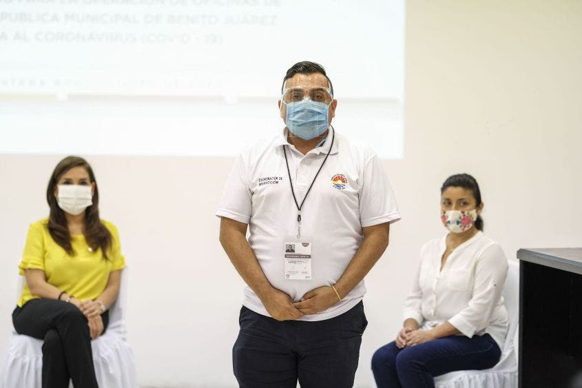 Con «Responsables covid-19» se garantizan espacios seguros y saludables.- Para garantizar condiciones de trabajo seguras y saludables tanto para los usuarios como para los empleados, el Ayuntamiento de Benito Juárez conformó el programa Responsables COVID-19, integrado por trabajadores municipales que este viernes recibieron los gafetes que los acreditan para vigilar que se cumplan con las medidas sanitarias en sus áreas laborales.