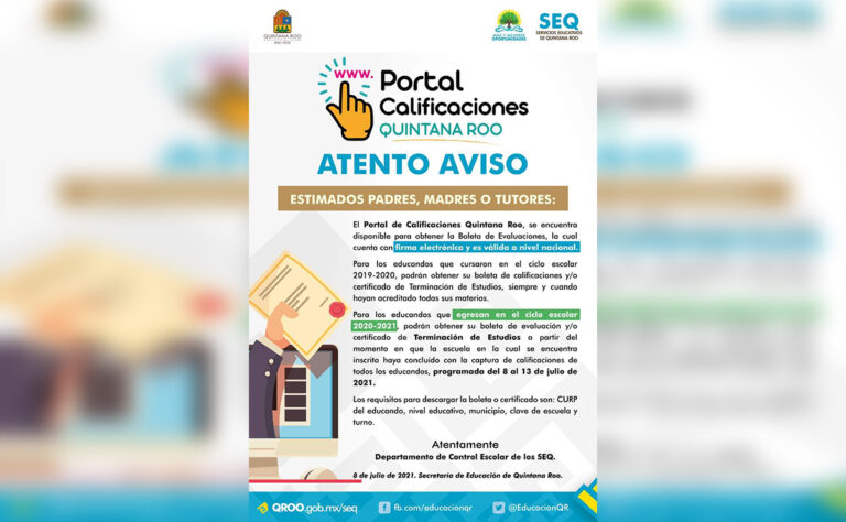 Los requisitos para descargarlas son: ingresar al Portal de Calificaciones Quintana Roo, tener a la mano CURP del alumno, nivel educativo, municipio, clave de escuela y turno.