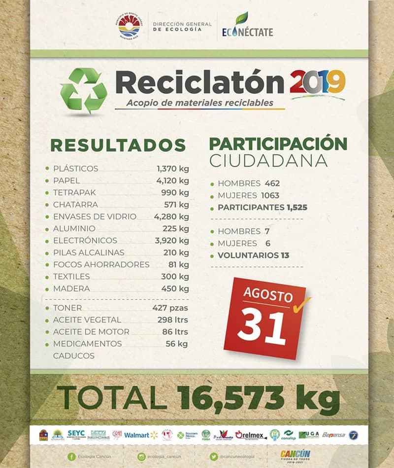 Con más de 16 mil kilogramos de residuos acopiados, cerró la décimo primera jornada de Reciclatón 2019, misma que se realizó el pasado sábado 31 de agosto en cinco puntos de acopio, establecidos en el Municipio de Benito Juárez, programa del que es responsable la Dirección General de Ecología.