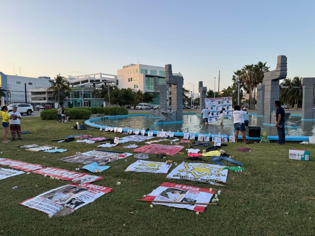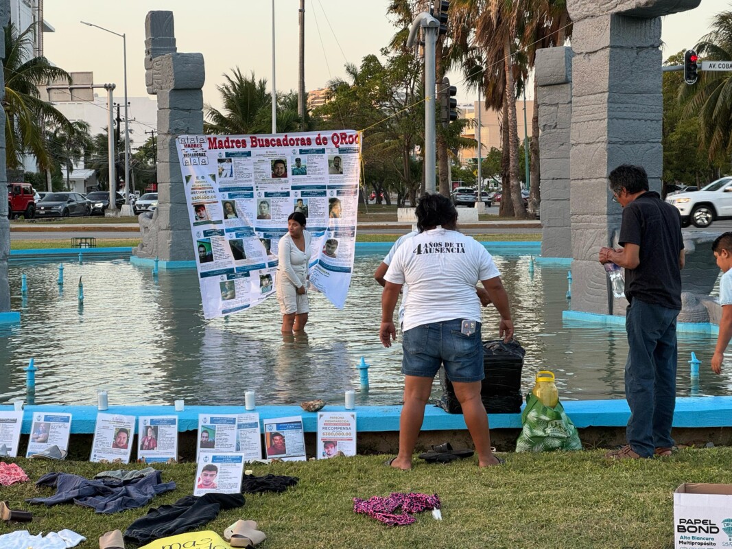 En este lugar, las madres buscadoras colocaron numerosas prendas y fotografías de familiares desaparecidos en Quintana Roo, así como algunas pancartas alusivas a las desapariciones de estas personas.