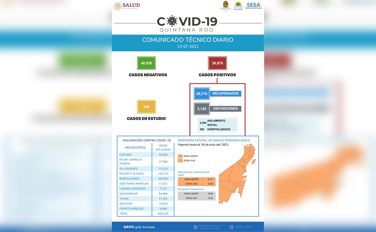 También se informa, que dentro de los esfuerzos de contención de la pandemia, se han aplicado hasta el momento un total de 800 mil 533 dosis de la vacuna contra el covid-19 en Quintana Roo.