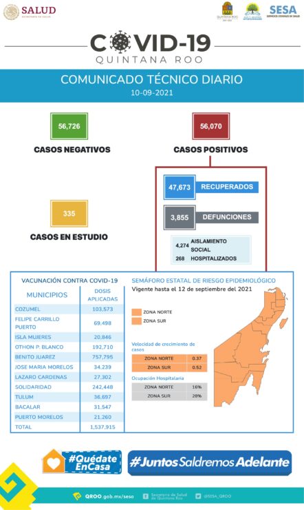 También se informa, que en lo que se refiere a la campaña permanente de vacunación contra el virus, el conteo de dosis aplicadas se ubica ya en un total de un millón 537 mil 915 dosis de la vacuna contra el covid-19 en Quintana Roo.