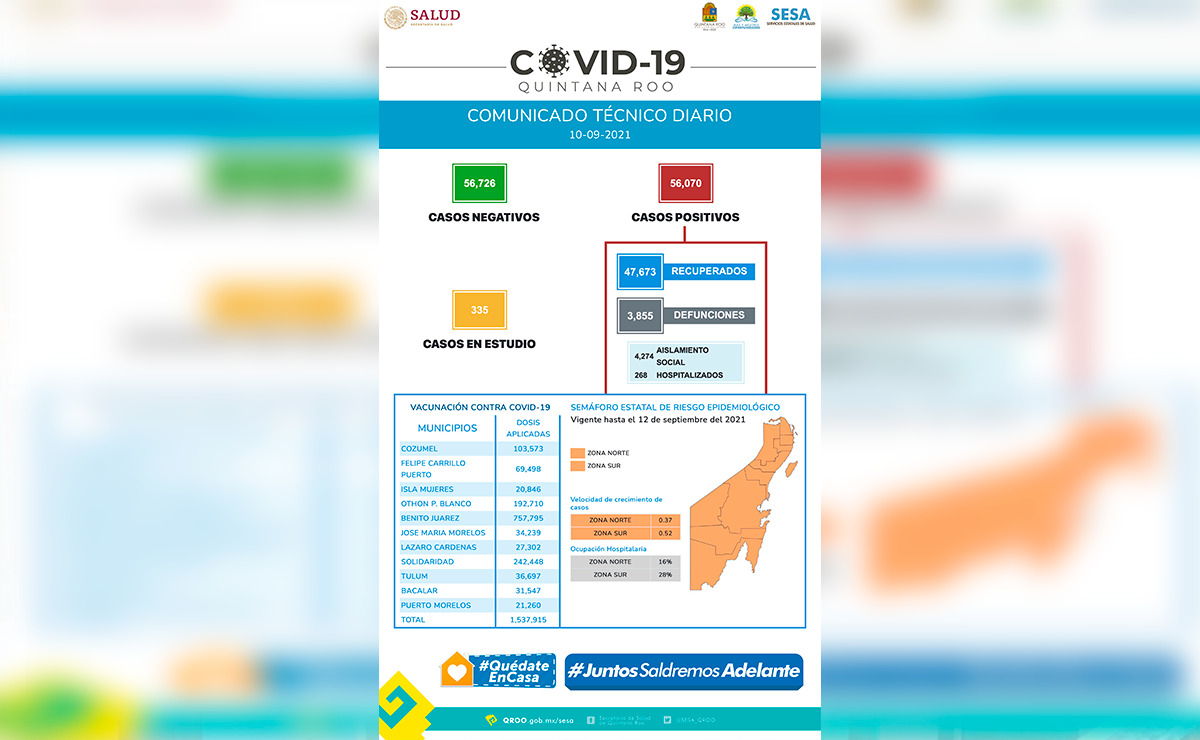 También se informa, que en lo que se refiere a la campaña permanente de vacunación contra el virus, el conteo de dosis aplicadas se ubica ya en un total de un millón 537 mil 915 dosis de la vacuna contra el covid-19 en Quintana Roo.