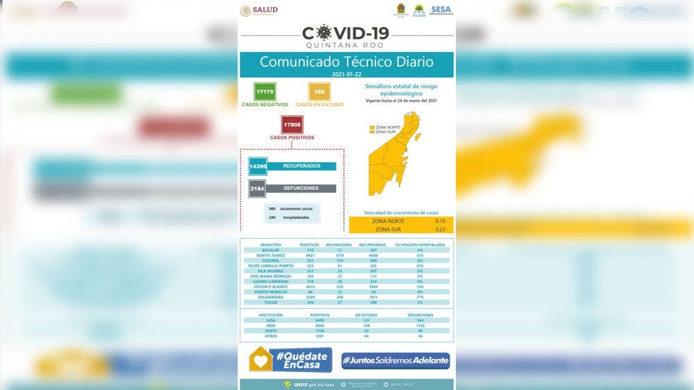 La zona norte de la entidad está al 0.19 por ciento y el sur al 0.23 por ciento en la velocidad de crecimiento de casos, mientras que la ocupación hospitalaria es del 33 por ciento en Benito Juárez y Felipe Carrillo Puerto, quienes tienen la taza más elevada de este rubro.