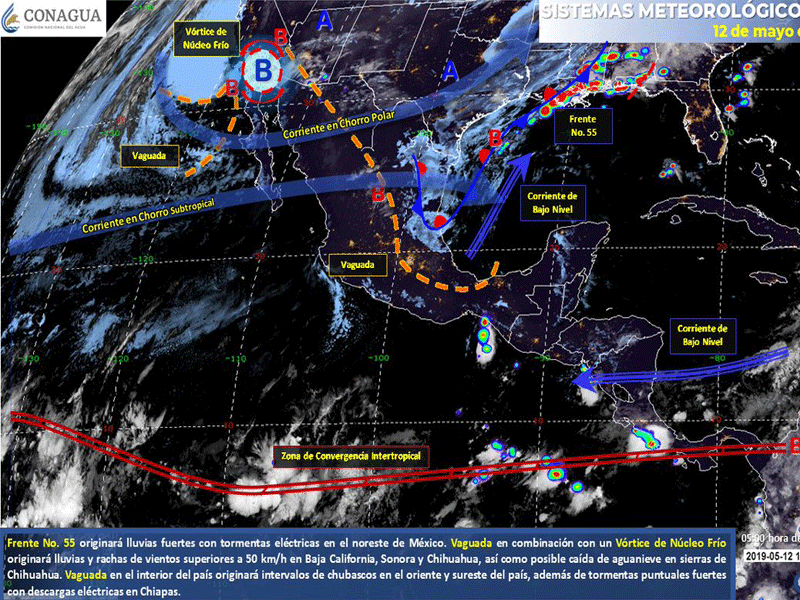 Tormentas puntuales fuertes se prevén en Chiapas y con caída de granizo en Nuevo León, Tamaulipas; intervalos de chubascos en Sonora, Chihuahua, Coahuila, San Luis Potosí, Querétaro, Hidalgo, Puebla, Veracruz y Oaxaca, y lluvias aisladas en Baja California, Tlaxcala, Campeche y Quintana Roo.