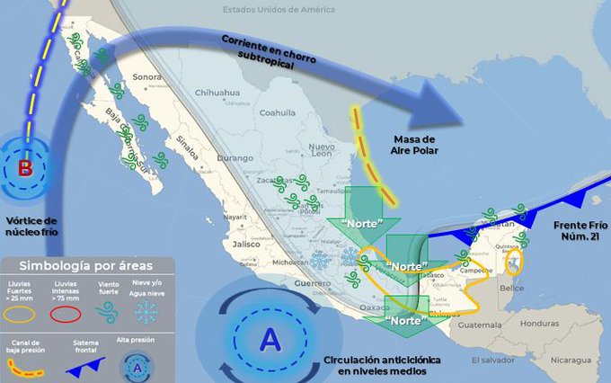 Quintanarroenses, a partir de este martes recibiremos el #FrenteFrío no. 21 con más lluvias, viento, actividad eléctrica y descenso de temperatura por la noche. Tomen sus precauciones. #JuntosSaldremosAdelante @ProtCivil_QRoo pic.twitter.com/k6VgSfqL3m