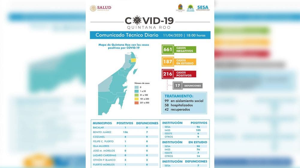 Las autoridades de salud especificaron que Bacalar se mantiene con 1 caso, Benito Juárez con 156 y 7 defunciones, Cozumel con 6 casos, Felipe Carrillo Puerto 1, Isla Mujeres 1, Othón P. Blanco 5 y dos defunciones, Solidaridad 41 casos y siete defunciones, Tulum 4 casos positivos y una defunción, en tanto que Puerto Morelos se mantiene con 1 caso.